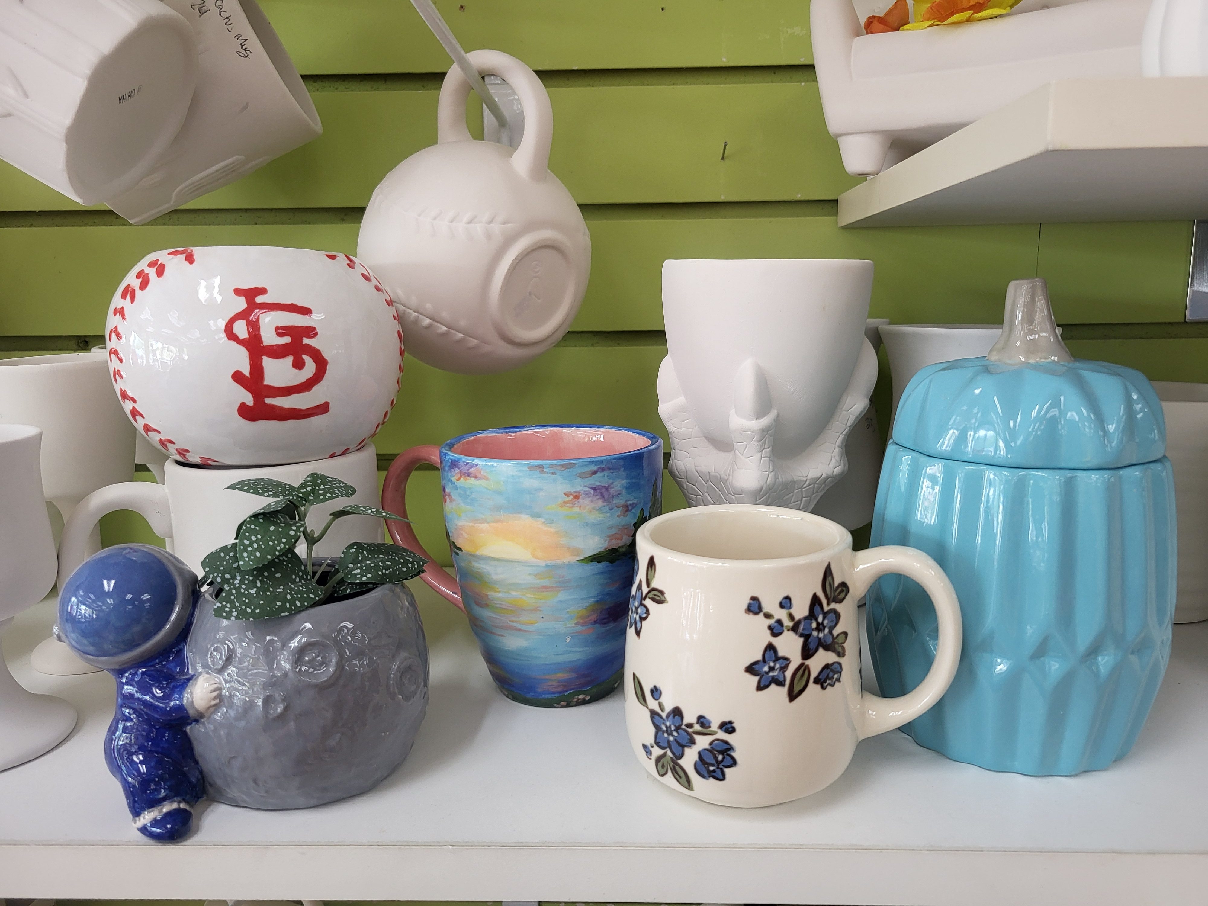 Choose Pottery Painting – Mugs, Planters, Banks, Figurines, Holiday items, and many more! Prices range from $15-$35